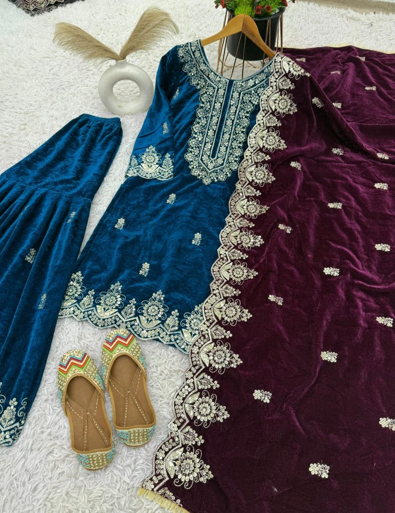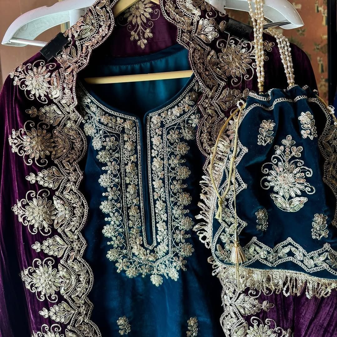 Exclusive Velvet Embroidered Suit Set – Fully Stitched with Sequence Work & Designer Lace Dupatta (Free Shipping)
