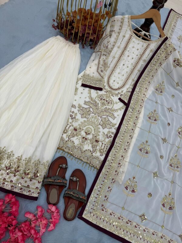 Look stunning in this premium readymade suit set, crafted with Heavy Fandy/Trendy Silk and decorated with 5mm sequence + embroidery work for a rich designer appeal. Perfect choice for festivals, parties, and family gatherings! 💕
