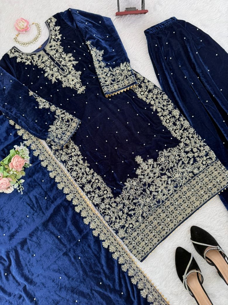 Bring home the elegance of Pakistani fashion with this NC Velvet Designer Outfit, crafted in rich Viscose Velvet and adorned with premium coding work, sequence embroidery, and rivet moti hand detailing.