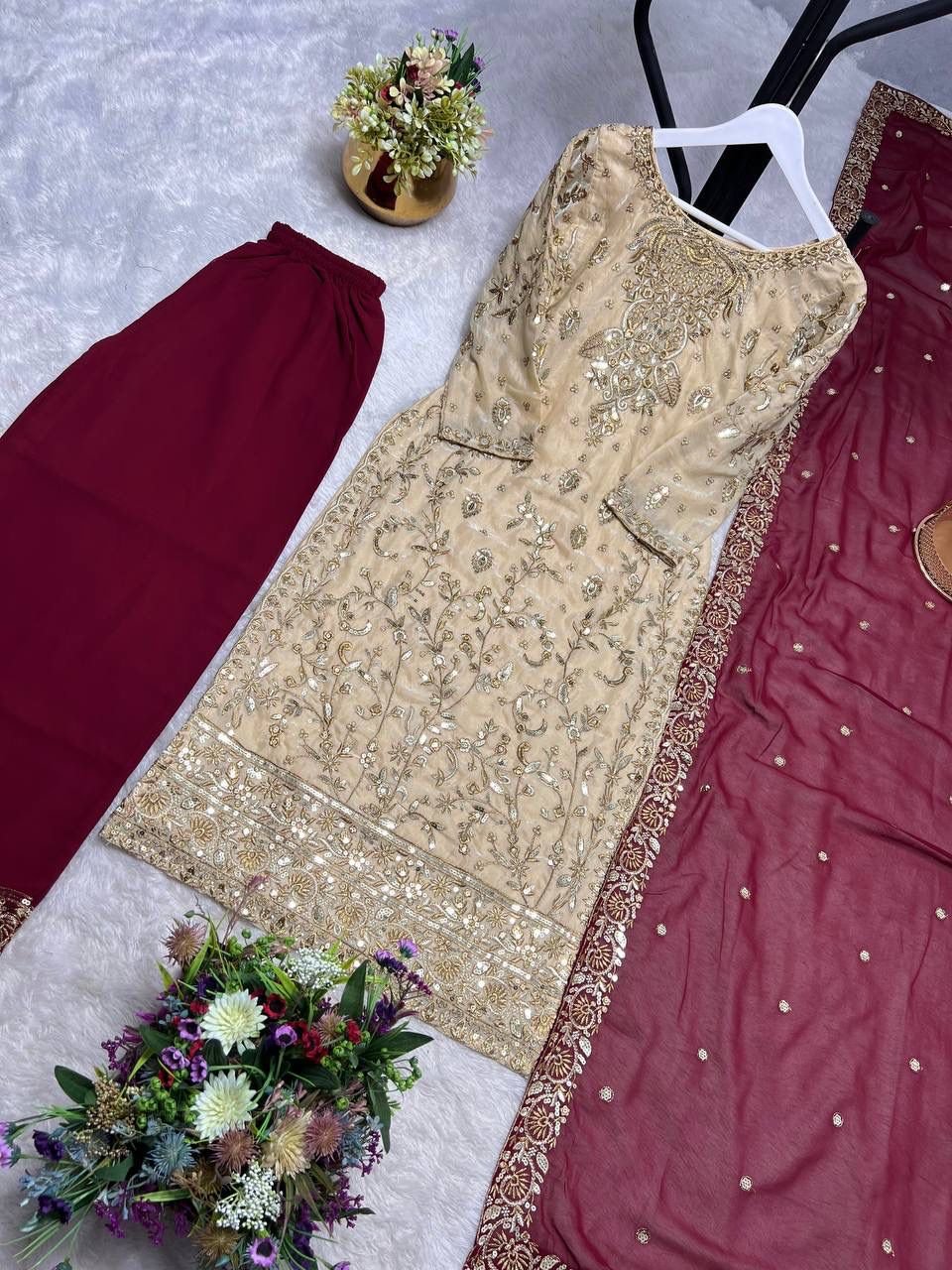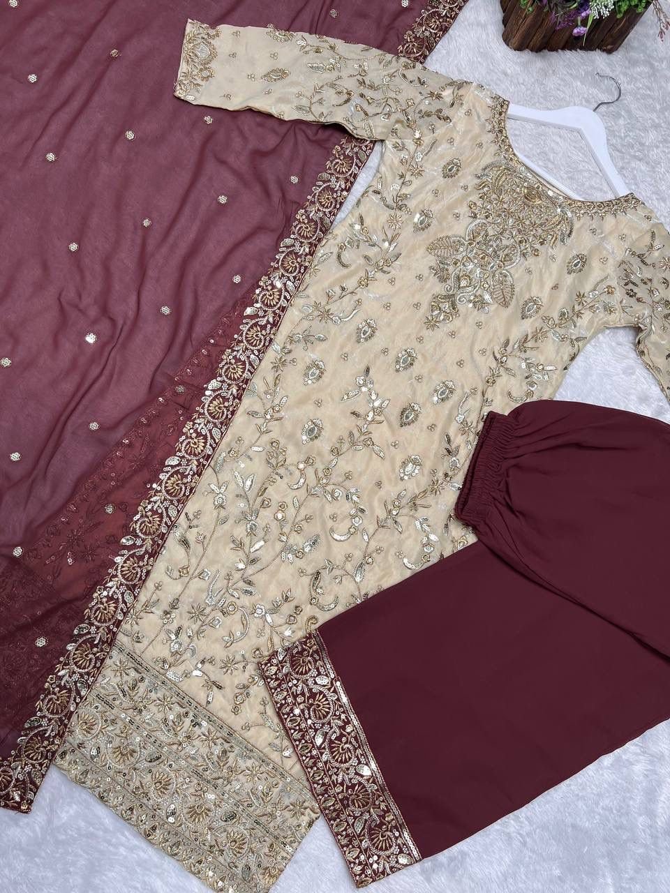 Presenting a luxury ready-to-wear designer outfit, crafted in Heavy Two Tone Trendy Silk Kurti with beautiful embroidery + sequence work on both sides. Paired with a stylish contrast embroidered palazzo and a premium faux georgette dupatta, this outfit gives a perfect festive & party look. 💃✨